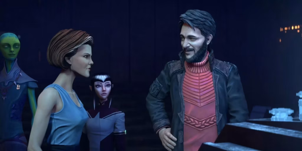 Dal and the crew arrive at the designated coordinates but are puzzled by how they will detect the hidden planet. After Gwyn figures out the planet is out of phase like her, Rok figures out a way to reveal it. They land the Infinity on the planet and head toward an ancient temple-looking structure known as a ziggurat. Strangely, one of the interior doors looks like a giant 20th-century door to a vault one would find on Earth. A mysterious figure steps dramatically out of the mist and into the light. It’s not Chakotay, but Wesley Crusher – the former Lt. Junior grade Starfleet Officer – who accepted an invitation to become a Traveler.